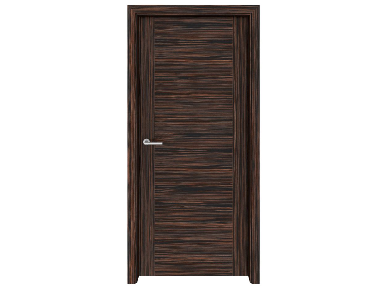 This particular interior door design features a veneer of genuine Ebony Macassar, a hardwood named after the small island in Indonesia where it is found. This exotic species features a reddish brown undertone with stripes of dark brown and black. As mentioned, the grain runs horizontally at the center, but is framed in with two vertically grained panels at either side running the full length of the door.