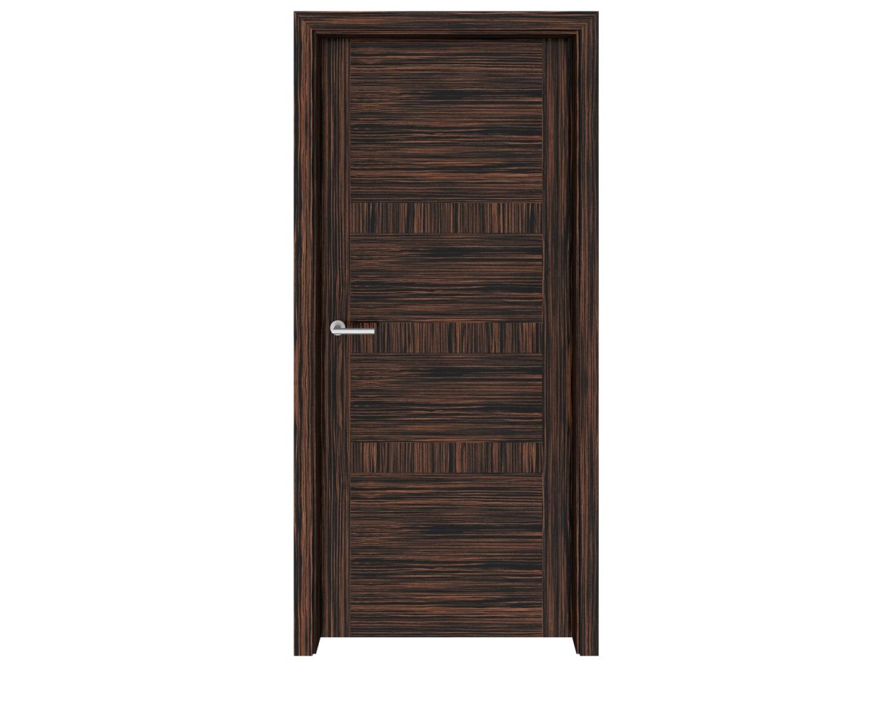 Ebony Macassar hails from Indonesia. It is prized for its deep chocolaty color and dramatic grain. In this door design, the wood veneer is placed in vertical and horizontal directions, with three distinct horizontal lines at the center, where the grain runs vertically.