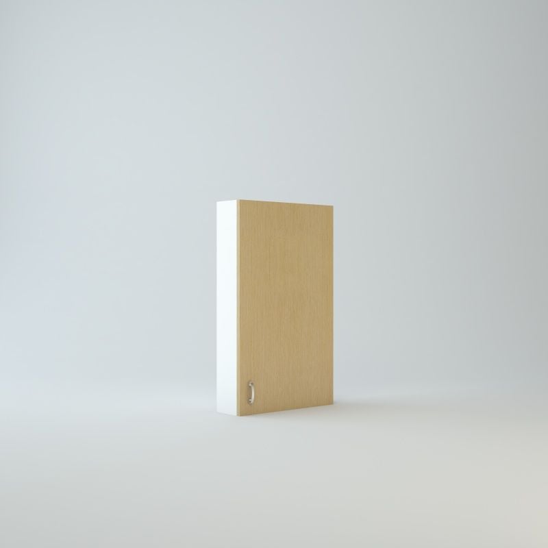 Single-door medicine cabinet in light oak finish, 30 inches high by 18 inches wide, wall-mountedSingle-door medicine cabinet in light oak finish, 30 inches high by 18 inches wide, wall-mounted