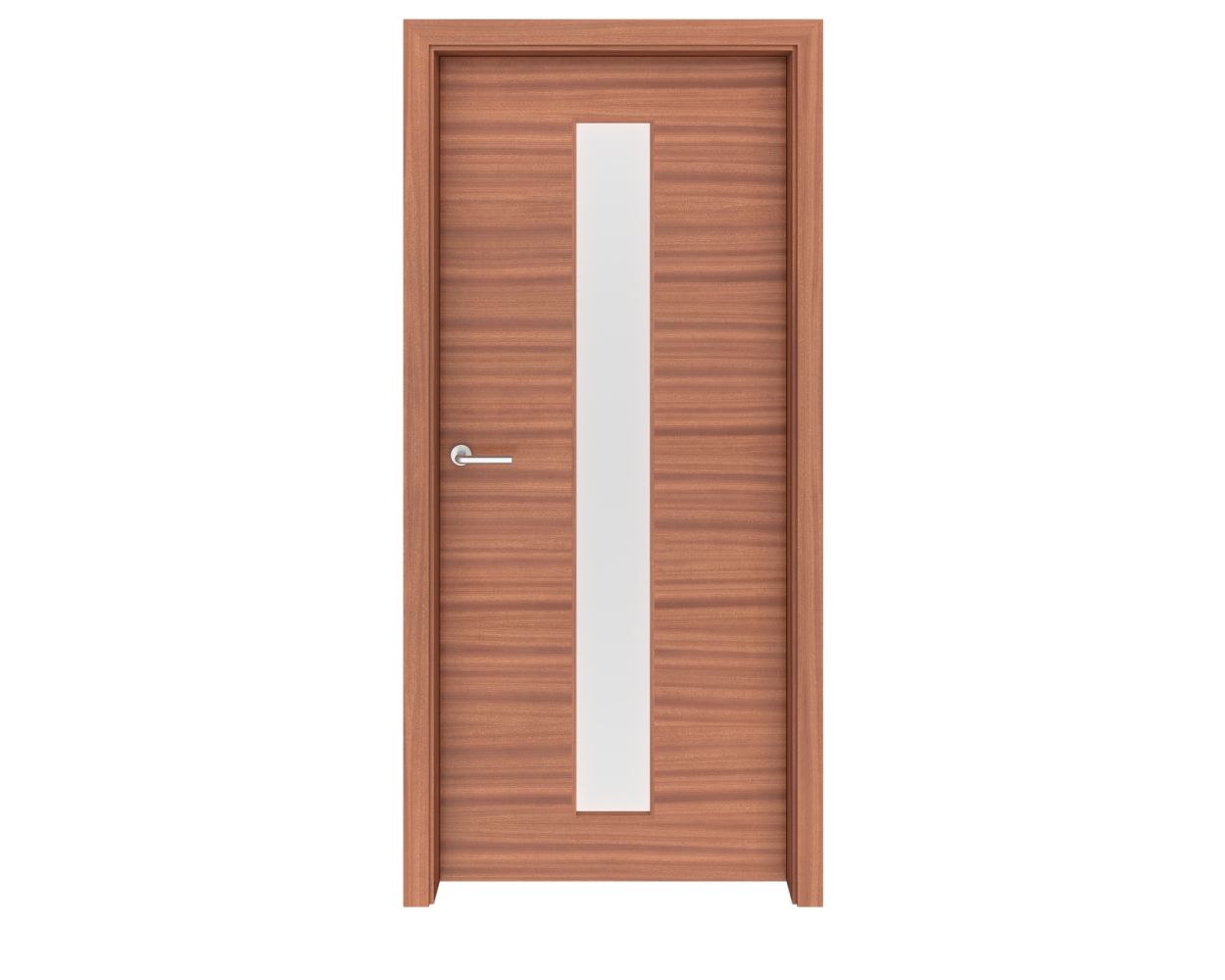 In Sapele Mahogany veneer, this interior glass door puts the accent on modern style while providing an essential function. In this design, the grain of the wood veneer runs horizontally throughout, while a narrow pane of glass runs vertically down the center of the door.
