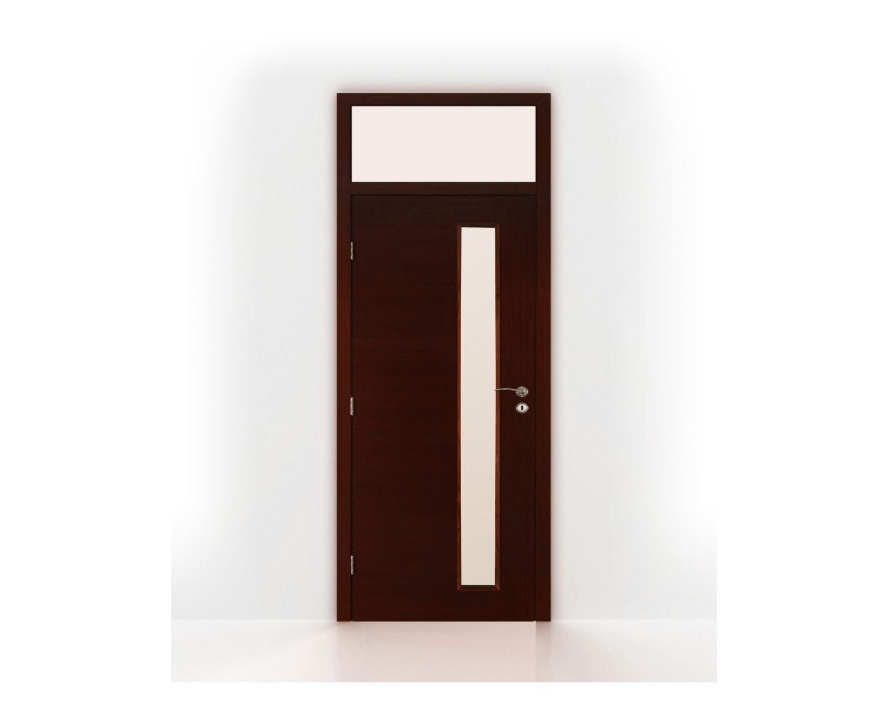 Like components of a cubist painting, frosted white glass panels are positioned this way and that on this modern transom interior door. It is made of solid wood with a wenge veneer applied on top with careful attention to the direction of the grain. Wenge is a rich dark brown wood found in Africa and is prized for its elaborate feather like grain. This interior design door is also set in a matching wenge frame and has coordinating hardware in a sleek satin chrome finish. The juxtaposition of dark wood and frosted glass has an undeniable edge that could be seen as entirely modern, or even Asian-influenced, like a Shoji screen. This designer door would look fabulous paired with modern furnishings in a high rise office in Manhattan. Alternately, it would serve well in a modern bathroom suite, where style is just as important as functionality.