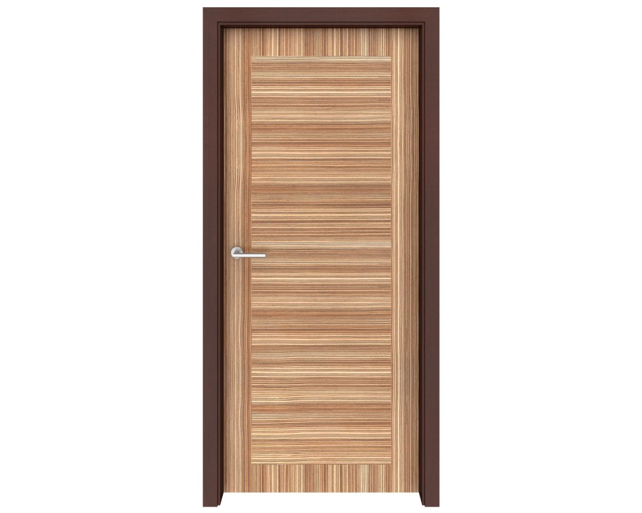 This flush interior door resembles traditional paneled doors but it gets its design entirely from natural zebrawood veneer rather than woodcarving techniques. Zebrawood is an exotic hardwood valued highly for its light blond color and darker variations of grain. Here the veneer runs with a horizontal grain at the center of the door, and a vertical grain at all edges.